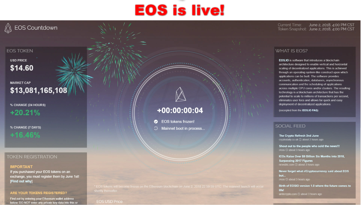 EOS mainnet launch countdown replay. This is the exact moment when the EOS mainnet goes live, today June 2, 2018 at 4:00 PM CST