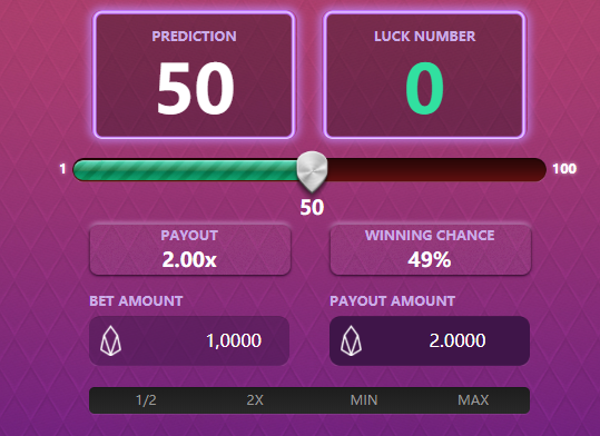 Mostly, Endless Game is a more complex Dice game. The dice part is basically exactly what you know from all other dice games on blockchain: you put in your bet and the number you bet you'll roll the dice under (e.g. 42), and you'll get a potential payout that provides you with an expected value (EV) of 0.98 per 1 EOS. Sounds weird? Let's check an example: