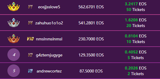 (in this case, eosjjsslove5 made roughly 3.2 EOS on ~560 EOS wagered, making up for 0.57% plus 50 tickets)