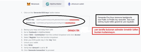 Evet blockchain ekosistemi içerisindeki herkesin bildiği gibi public ve private keyler sizin herşeyiniz lütfen bunları kaybetmeyin ve güvenli bir yerde saklayın. Private ve Public keylerimizi kaydettikten sonra bu site üzerindeki işlemimiz bitti bundan sonrası myetherwallet üzerinde devam edecek