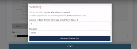 Açılan ekranda Amount to send ……. Bölümü 0, Gas limit bölümü 90.000 den fazla olmalı generate transaction diyerek devam edelim açılan ekrandan yes I am sure… diyelim transferi tamamlayalım ve tamam eos kayıt işleminiz oldu.