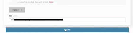 aşağıda açılan bölümden select a function dan register seçelim açılan bölümde key string bölümüne eos.io sayfasından almış olduğumuz public keyimizi yazalım.