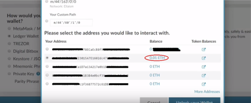 Mew üzerinden connect diyerek devam etmiştik, Ekranda etherum adresleri görünecek herhangi birini seçip devam ediyoruz.