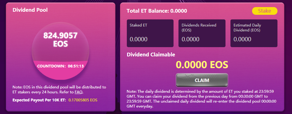 Mine ET tokens and Lottery tickets. For every EOS wagered you will get 2.5 times ET tokens. Its a perfect opportunity to mine ET tokens. Of course the tokens can be bought on an EOS exchange as well.
