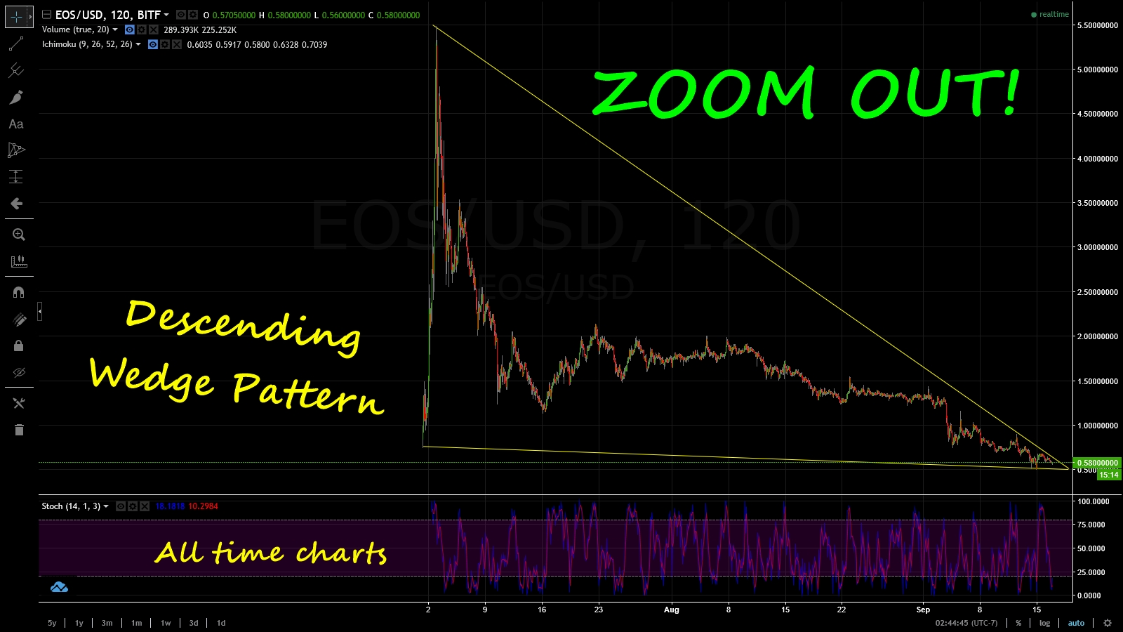 This formation, which is called a descending wedge, usually indicates that an upward movement is imminent. The price can only fall so low before everybody realizes what a great deal it is. Even at 60 cents right now EOS is a STEAL because many ICO investors got in around 90 cents. They release 2 million EOS tokens a day rather than doing traditional coin distribution methods like mining, staking, etc. Additionally the price may remain depressed for a while longer as Chinese users dump what they can before the bans are implemented.