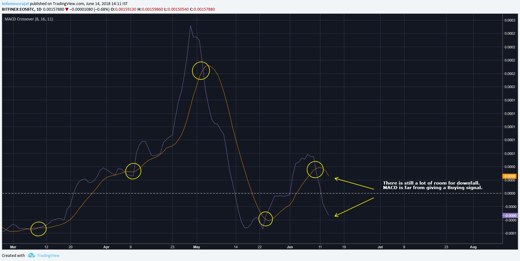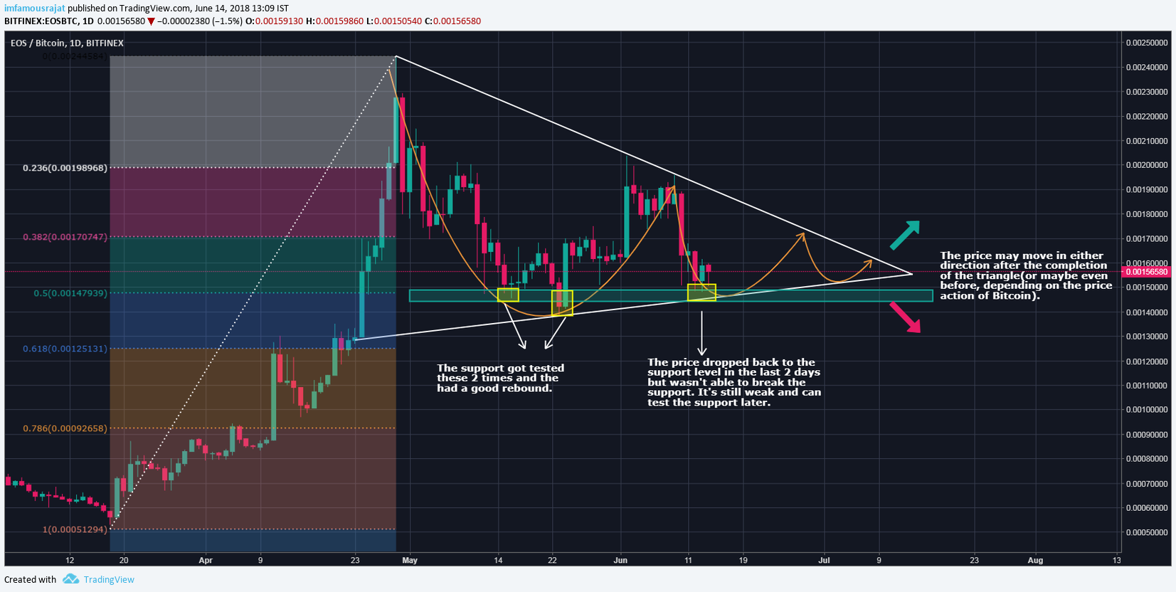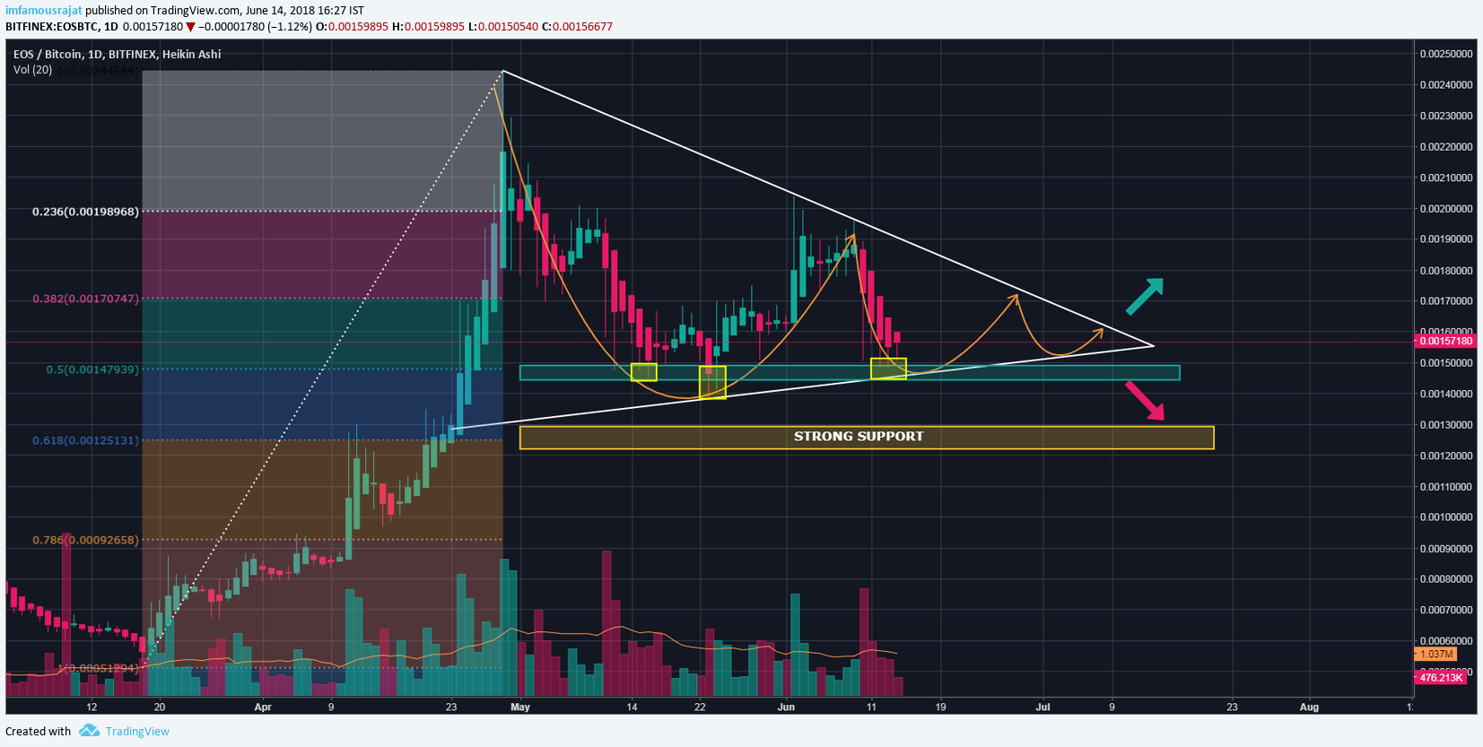 The price has perfectly rebounded twice in the past, from 0.5 fibonacci level on 16 May and 24 May respectively. Now the price has moved back to the same support region since the last 2-3days. This is a critical level for EOS because if if doesn’t rebound from here, then it’s gonna fall further to 0.618 Fibonacci level, somewhere around 125k satoshi(0.00125000 BTC) which should act as a strong support then.