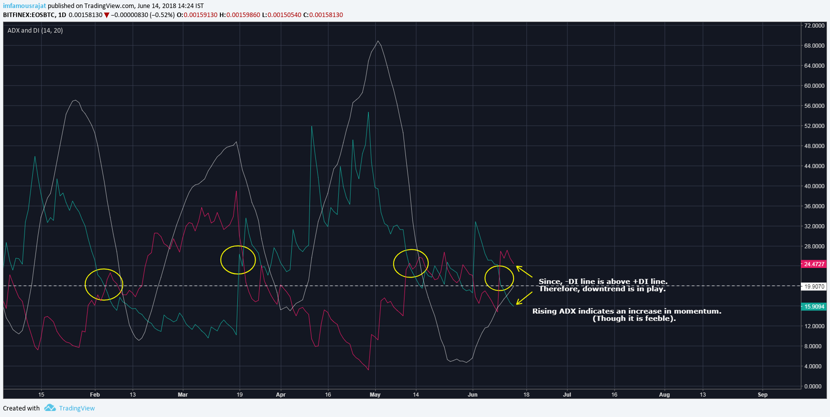 -DI just moved above +DI, few days back which shows bears are in control of power. Though the value of ADX is only 19.9(atm), but may rise(or maybe fall) anytime soon which supports the strentgh of down trend.