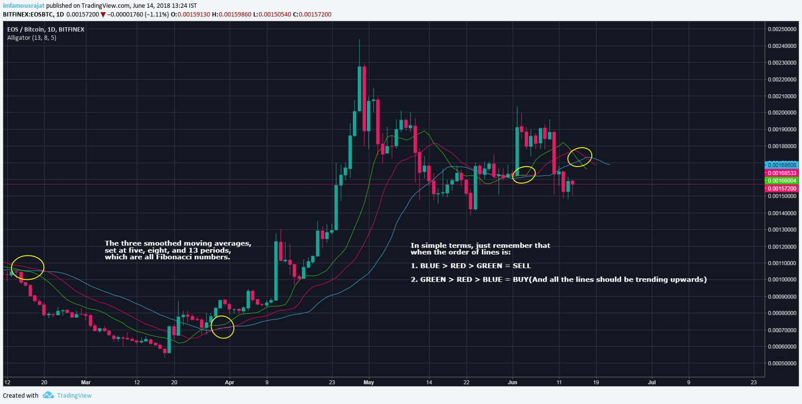 Basically, The Alligator indicator uses three smoothed moving averages, set at five, eight, and 13 periods, which are all Fibonacci numbers. The initial smoothed average is calculated with a simple moving average (SMA), adding additional smoothed averages that slow down indicator turns.