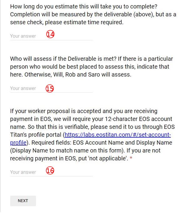 16.如果你的工作提案被通过,且你接受EOS作为报酬,我们要求你提供12位的EOS账户名。为了让账户名可认证,请在EOS Titan的个人资料站注册后发送给我们(https://labs.eostitan.com/#/set-account-profile)。需要填写的部分有EOS Account Name(EOS账户名)和Display Name(显示名,需要与这个表格中填写的姓名相同)。如果你不接受EOS,请填“not applicable”。