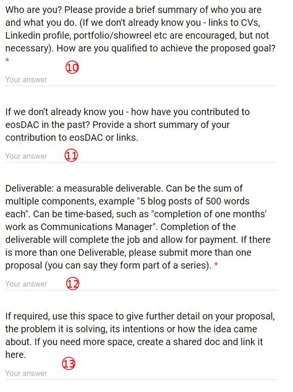 完整填写工作人员提案申请表格(*表示必填)后提交,eosDAC 团队的成员将根据提案的内容、可操作性和对DAC的价值来对提案进行评估,一旦提案被通过,申请人将会收到电子邮件确认以及其他相关信息。