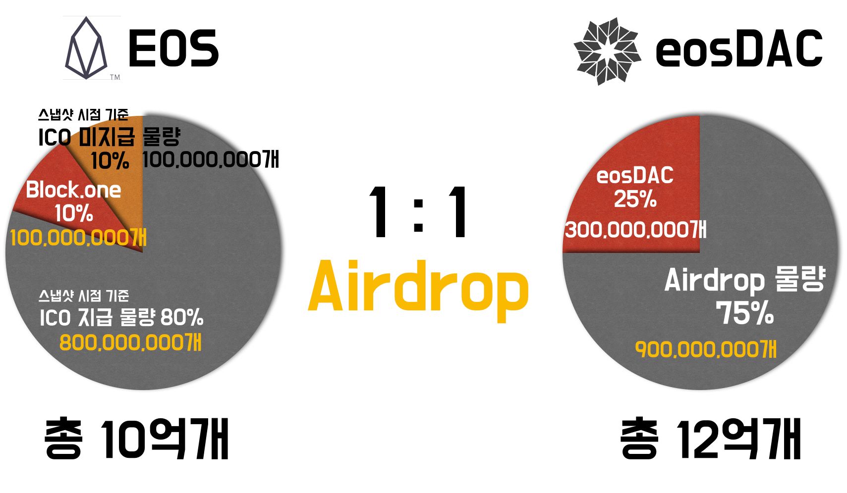 eosDAC 토큰의 총발행량은 12억 개로 그중 75%인 9억 개를 EOS 홀더들에게 1:1로 비율로 에어드랍했습니다. 스냅샷 시점에서 EOS 코인의 총발행량이 9억 개였으니까, Block.one을 포함한 EOS 홀더들에게 9억 개의 eosDAC 토큰을 1:1 비율로 에어드랍해주는 거죠.