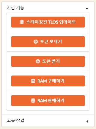기본적인 스테이킹 전송 등의 명령은 옆의 메뉴바에서 가능 합니다.
