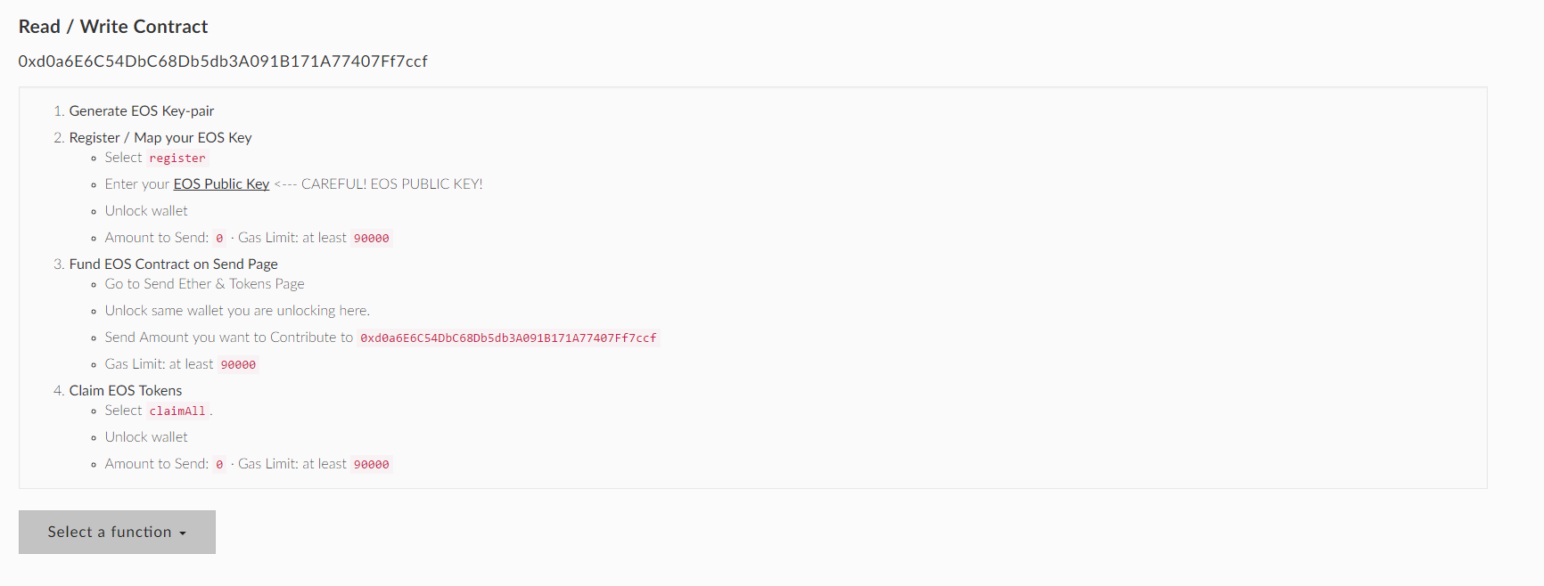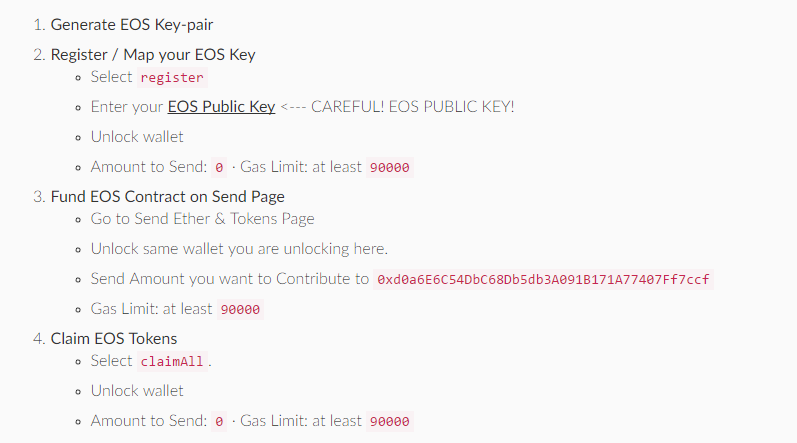 To participate in the EOS Token distribution you will need to send ETH to the Ethereum smart contract address set forth below during a period of your choice. The EOS Tokens will be reserved for you to claim when the period is completed. The minimum contribution amount is 0.01 Ether.
