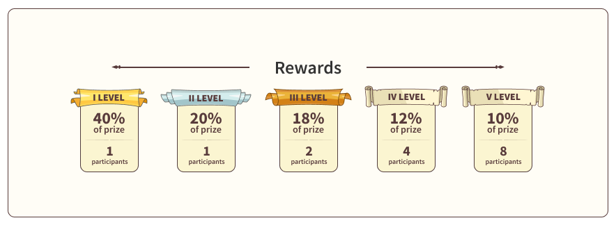 This prize will be distributed between winners in the following way: 40% of the prize to the wizard-winner with maximum number of victories, 20% - for the second place, 18% to wizards on the third place, 12% will get wizards on the fourth place and 10% will be distributed between wizards on the fifth place.