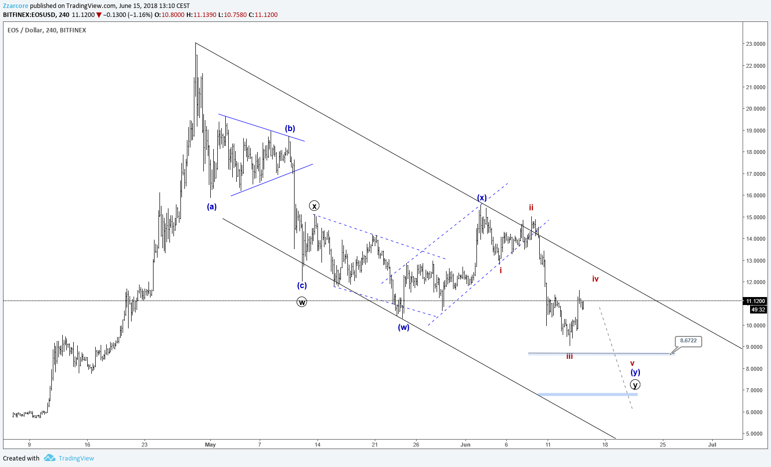 Since then EOS had a nice retracement. It could be that the retracement is already over. But the internal structures are unclear. More time will hopefully clear up the structure. But for now I expect more sideways movement around the current levels.