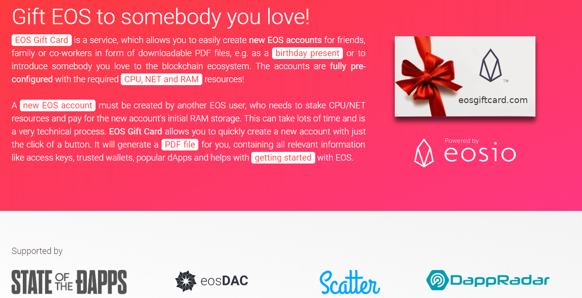 - For those who want to gift EOS accounts to noobs, check out this EOS Gift Card project. https://eosgiftcard.com/