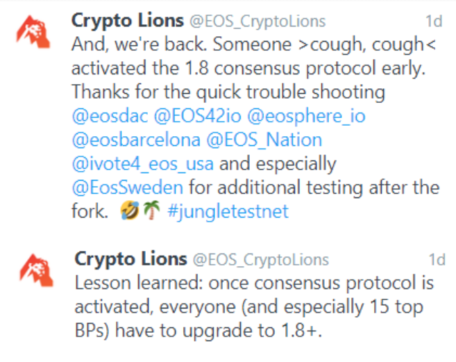 eosDAC, along with many other BPs, activated and tested the EOSIO Consensus Protocol Upgrade v1.8 on Jungle Testnet. Here’s what we learned. Once consensus protocol upgrade is activated, any node running < v1.8 of EOSIO software will kicked from the network.