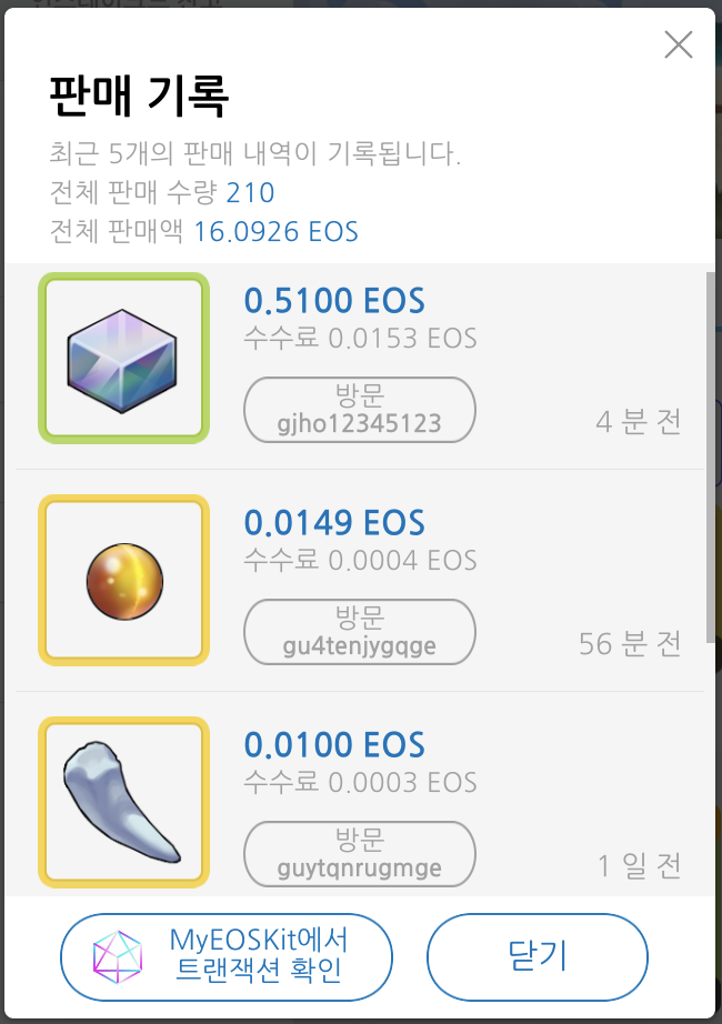 많이 파셨군요. 저는 판 거, 산 거 계산해 보니 15 EOS 정도 벌었네요. 시간 대비 벌이는 신통치 않지만 나름 재미가 있어서 만족합니다 ㅎㅎ