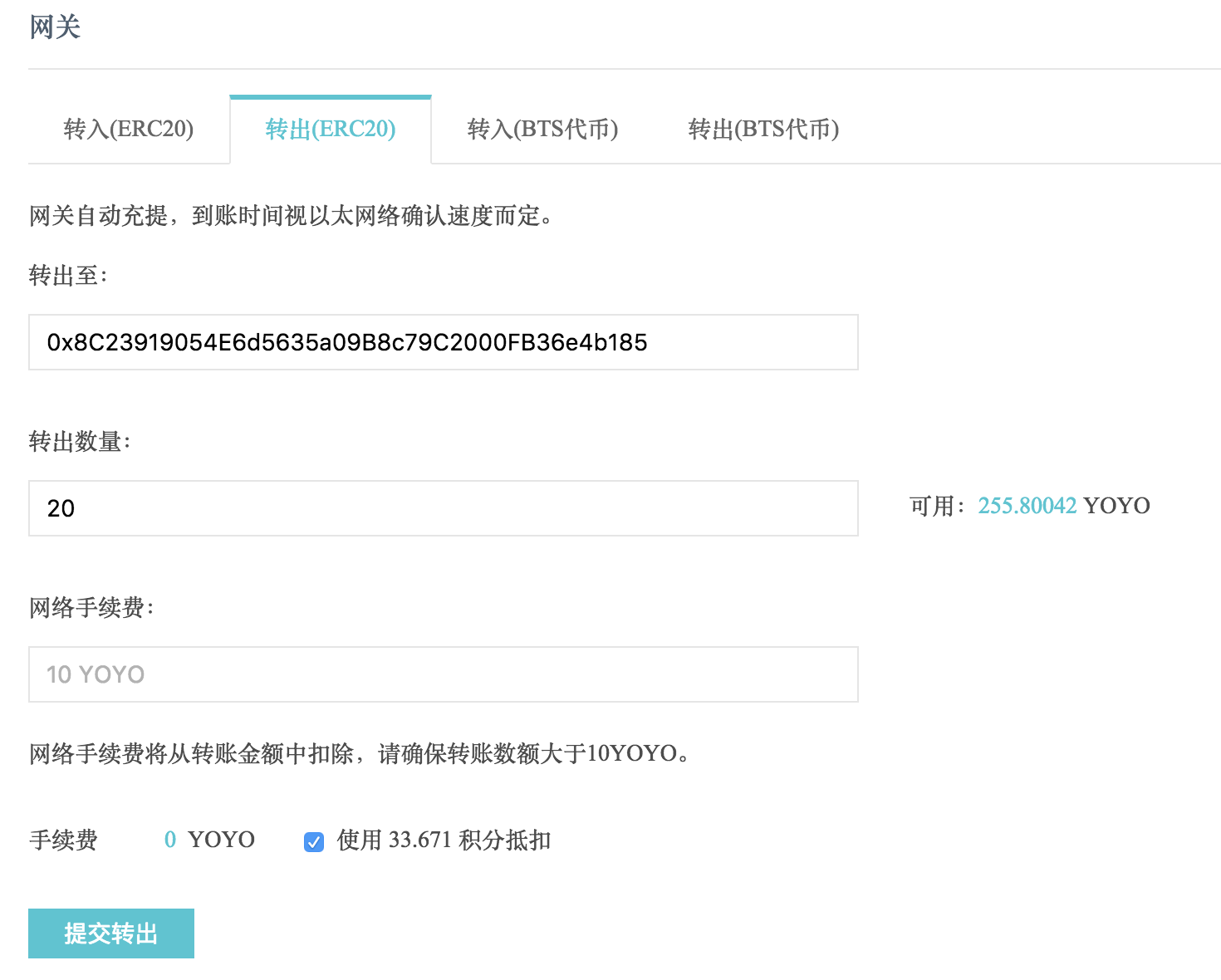 YOYOW从ERC20转到主网,先需要在网关获得对应的ETH地址,然后从交易所或者ERC20钱包往此地址转YOYOW。