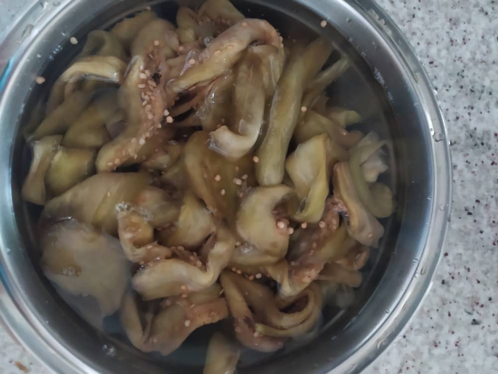 Lava las berenjenas para eliminar la sal, escúrrelas y colócalas dentro de un recipiente con ¾ partes de agua y ¼ de vinagre. Deja remojando durante 2 horas. (importante que queden completamente cubiertas)
