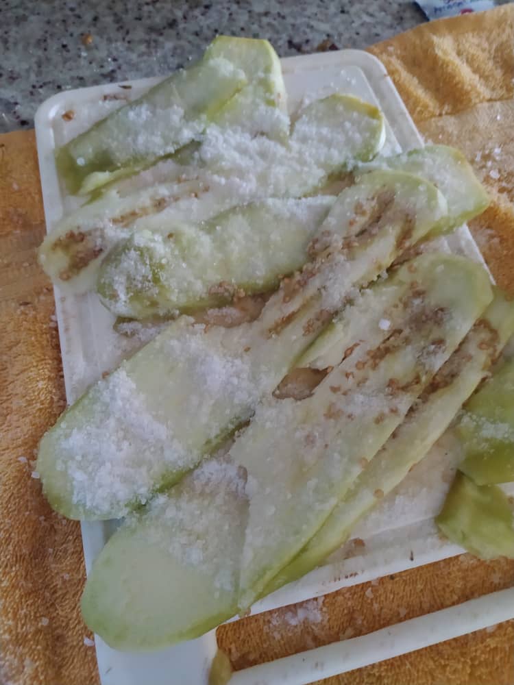 Acomódalas dentro de un colador grande, en capas, espolvoreando con sal para que se drene lo amargo . Tapa con un plato o un recipiente pesado que genere presión. Deja reposar durante 5 horas.