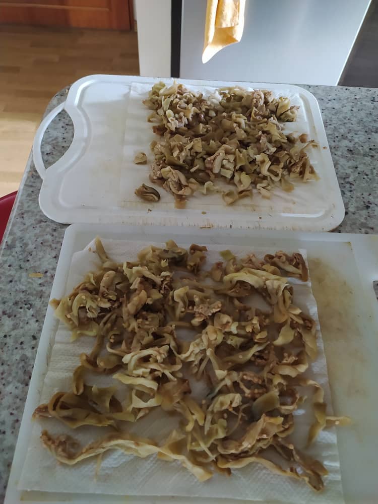 Exprime bien, seca con toallas de papel y corta las rebanadas en tiras.