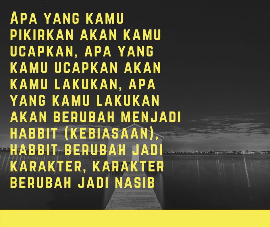 Apa yang kamu pikirkan akan kamu ucapkan, apa yang kamu ucapkan akan kamu lakukan, apa yang kamu lakukan akan berubah menjadi habbit (kebiasaan), habbit berubah jadi karakter, karakter berubah jadi nasib