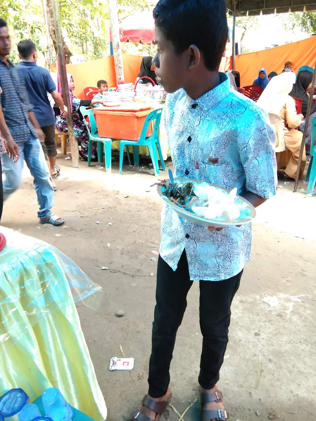 on the sidelines of enjoying the food served while chatting with friends in addition to suddenly a small child seen passing in front carrying a plate of rice.