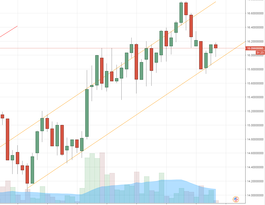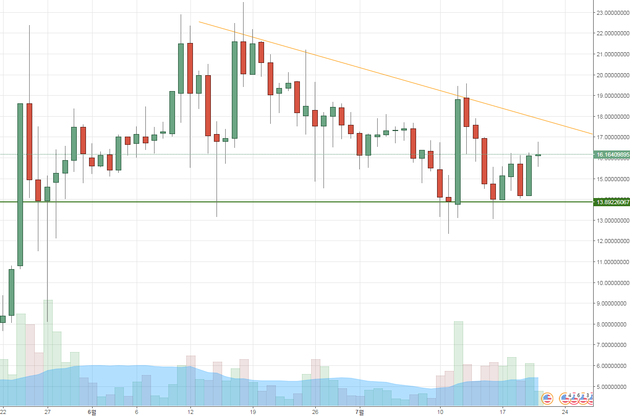 1일봉으로 보니 횡보? 수렴? 처럼 보이기도 하네요! 단기적으로 봣을땐 상승세지만 크게보니 13.8달러를 기준으로 수렴할 가능성도 보입니다!
