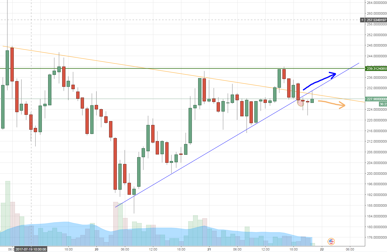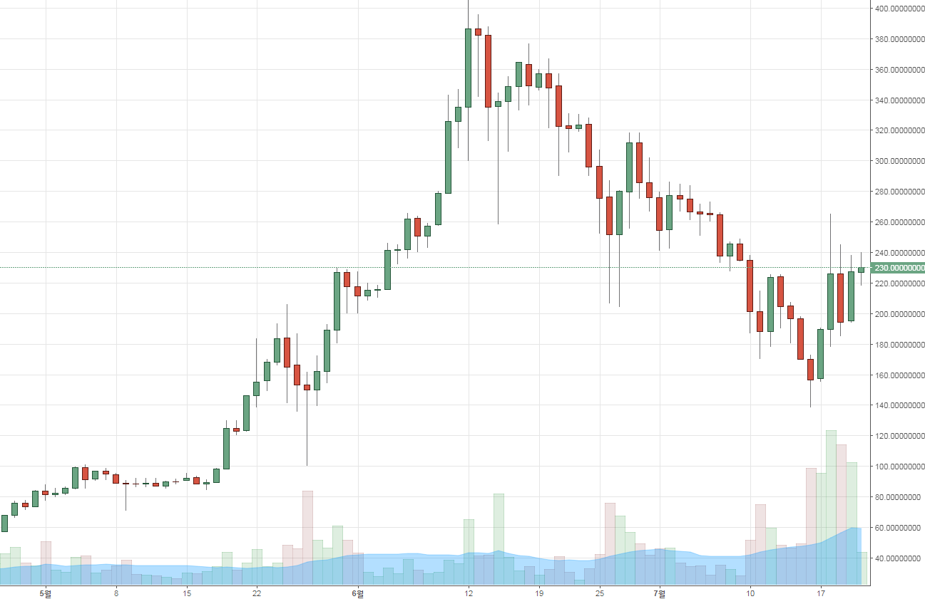 오늘 총알 일발 장전해서 코인원에서 마진을 태워봤는데 말아 먹었군요 ㅠㅠ 240달러에 수렴할줄 알고 분홍색 동그라미 부분 쯤에 분할로 공매수를 시도했었어요 ㅠㅠ 근데 코인원이 터지고 다음 두개가 노란색 선을 따라 약하게 하락장을 보이길래 포지션을 정리 했는데 다음에 양봉이나오면서 파란선을 따라갈꺼같은 느낌을 주네요... 아직 저는 개미일 뿐인가 봅니다 ㅠㅠ 2~3개 보면 어디로 갈지 확실히 방향이 나올듯 하네요 !
