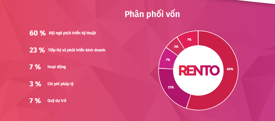 Rento đang gây quỹ để phát triển Nền tảng cho thuê / chia sẻ toàn cầu. Kinh phí sẽ được được sử dụng cho các hoạt động hàng ngày, phát triển, tiếp thị và các giải pháp kinh doanh bổ sung của Nền tảng Rento.