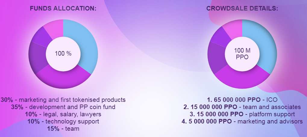 $ 65 million PPO is offered to ICO. 5 million PPOs are devoted to marketing and payment consulting efforts. The platform will be supported with 15 million PPO. 15 million PPO is reserved for the team. A total of 100 million PPOs will be printed.