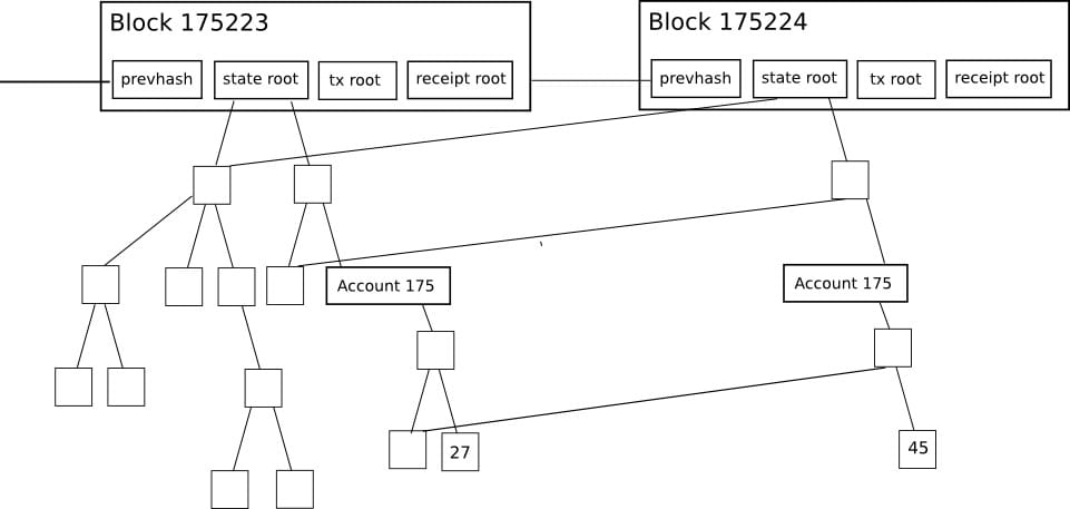 而以太坊不同于比特币,只有一个交易记录树,以太坊包括3个Merkle树: