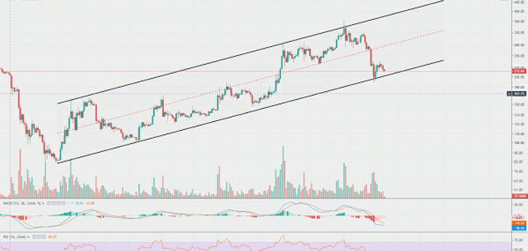ETH daily trend, from December 18 to the present, the overall trend is still in the rising channel all the way up concussion. After reaching the bottom of $80 in December 18, the currency rose to the highest of $366 in 1999, then dropped sharply to the lowest of $191 and then rose back to the current $224. In the long run, the overall trend is still relatively strong. Last week, after falling below the M-head and neck support of the upper daily line, the currency ushered in an accelerated downward trend, and the lower edge of the lower passage appeared in the Japanese K. However, it was immediately pulled back by the volume, which has not been broken these days and has been slightly shocked along the lower edge. Volume can be sharply attenuated, and has greatly attenuated to the cross-disk shocks near the earlier lower edge. The level indicates that the trend of weak shocks will continue in the near future. As long as it does not fall below the trend support, long-term money holdings can continue to rise. Short-term pressure is $220, supporting $200.