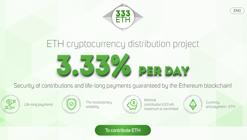 333eth.io는 시장과 매우 대조적입니다. 사이트 제작자는 영원한 기계를 발행하는 돈을 발명한다고 주장합니다. 투자자들은 같은 시간에 매일 3.33 %의 순익을 얻습니다. 한번에 기여할 수있는 최소량은 0.01 ETH입니다. 약 500명의 투자자가 리소스가 온라인 상태인 며칠 동안 거의 $100,000의 기부를 했습니다 (460ETH에 해당). 시간이 지나면서 숫자가 커지면 사용자가 변경 사항을 추적 할 수 있도록 그래프가 제공됩니다.