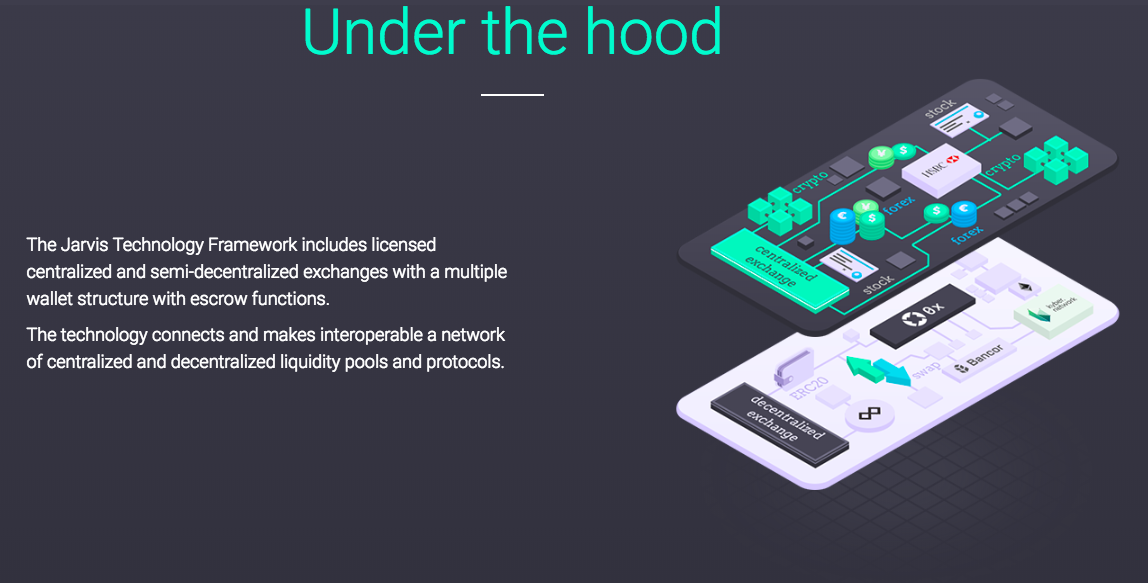 The Jarvis Technology Framework includes licensed centralized and semi-decentralized exchanges with a multiple wallet structure with escrow functions and thats a very important when you put in an exchange. Also, the technology connects and makes interoperable a network of centralized and decentralized liquidity pools and protocols.