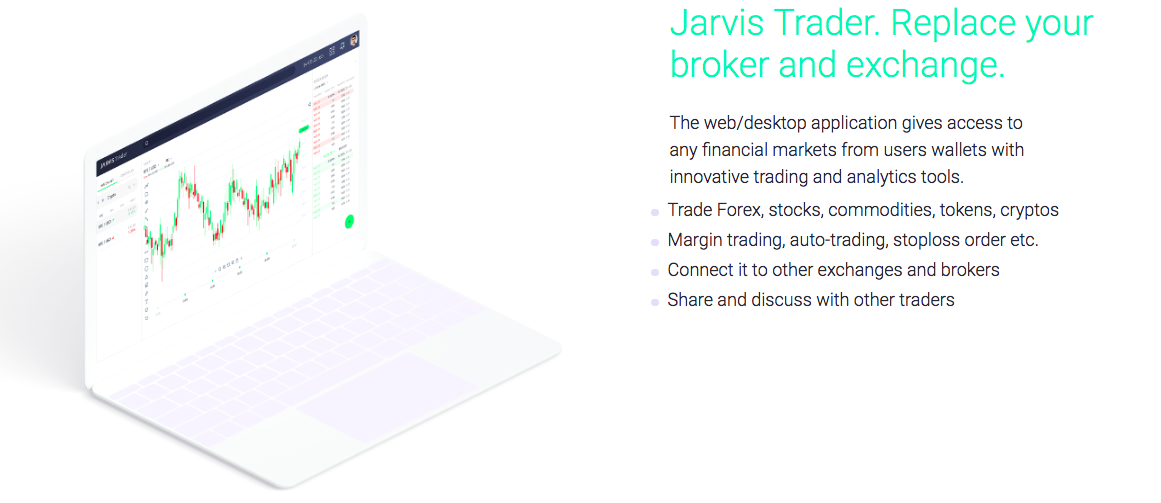Jarvis Trader. Replace your broker and exchange. The web/desktop application gives access to any financial markets from users wallets with innovative trading and analytics tools. Another great features for me that all traders or even a non trader people was looking for, where we can navigate thru web/desktop application confidently.