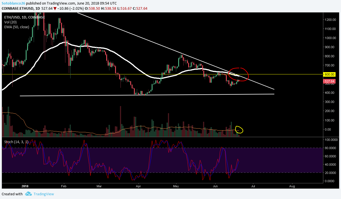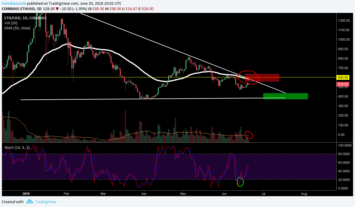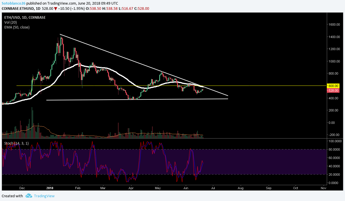 En primer lugar tenemos un triangulo descendente junto con una resistencia importante en los 600$ arrasstrada desde el 12 de diciembre del 2017. Los 600$ por ahora es un punto crítico en el cual es poco probable que el ETH logre superarlo