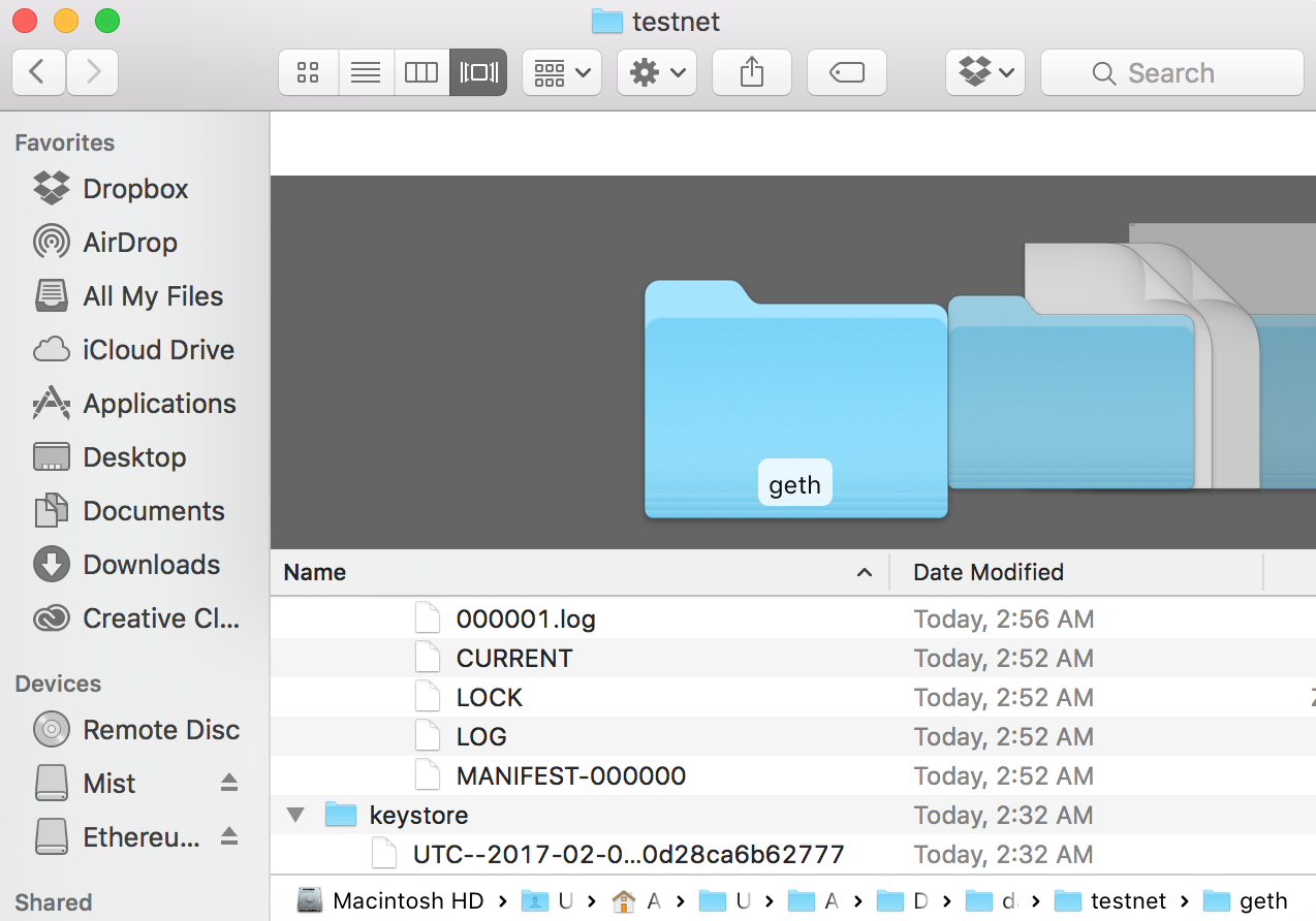 After a little bit, you’ll notice that your testnet folder auto-generates in your data directory, with a keystore directory. The address/handle provided earlier at Geth account signup points to this file in your keystore.