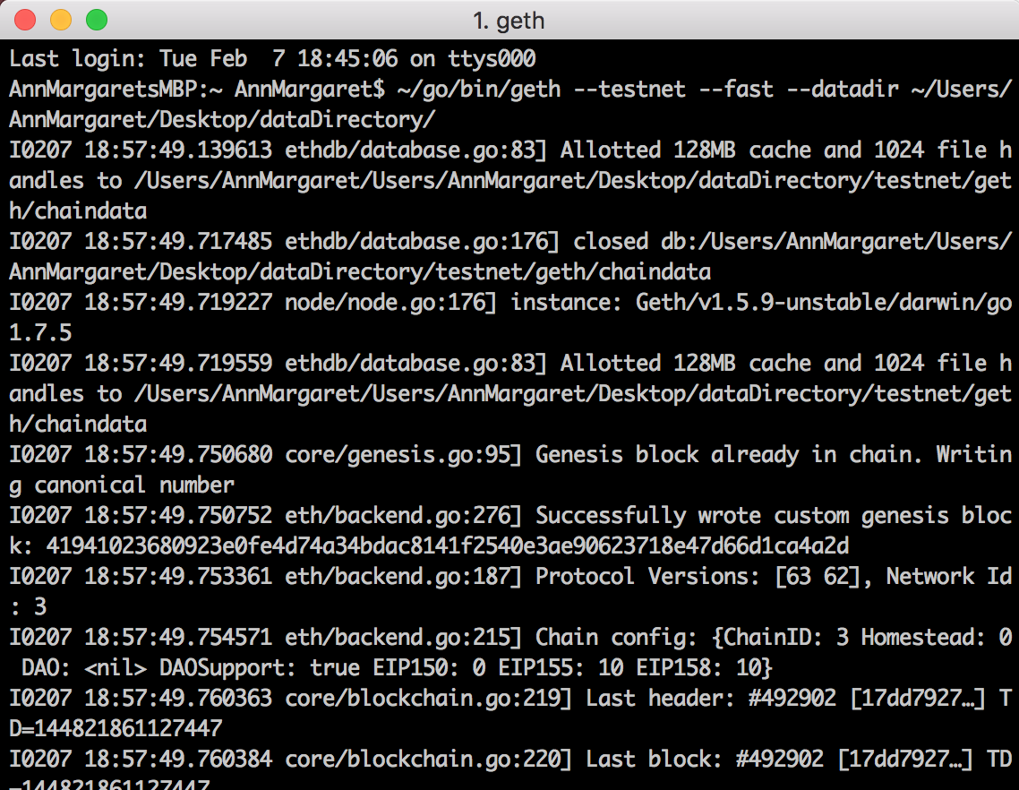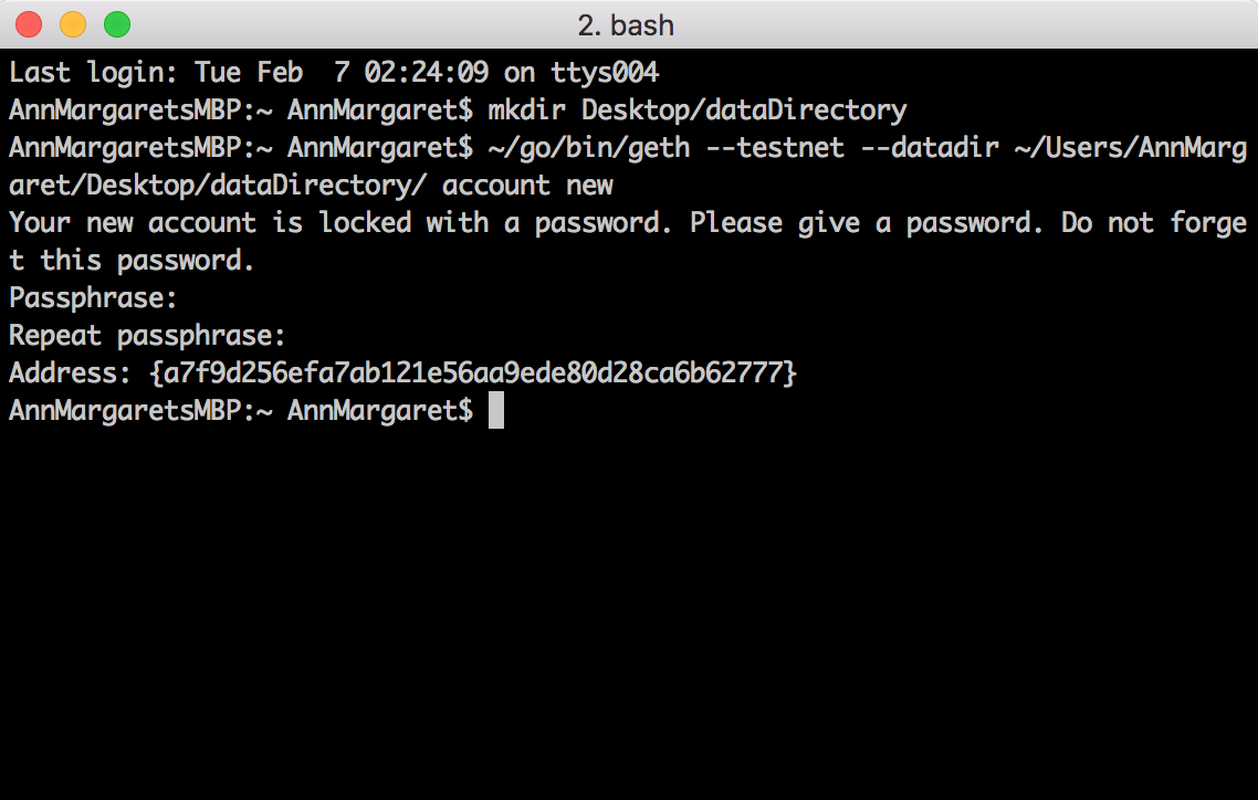 To proceed, the first thing we want to do is create a data directory for the geth node we’re about to launch. I’m going to put my data directory on the Desktop (because I put everything on my desktop, if I can help it).