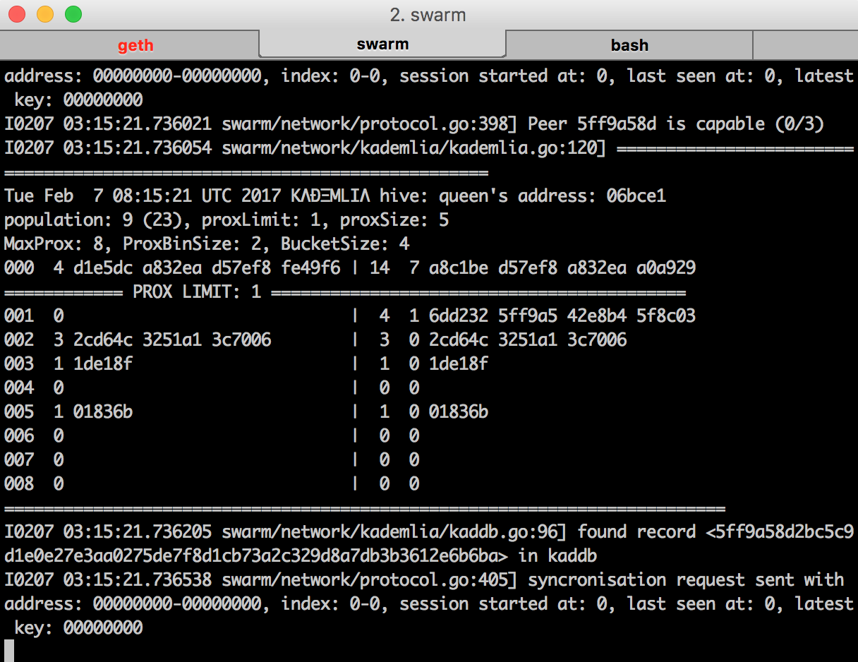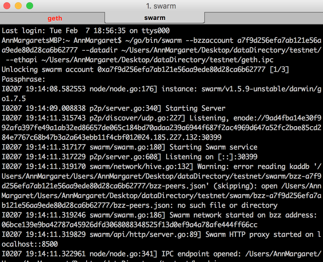Now, in a new terminal tab, we want to start up Swarm. To do this, we bash the swarm binary (same deal as with the geth binary) with three options: