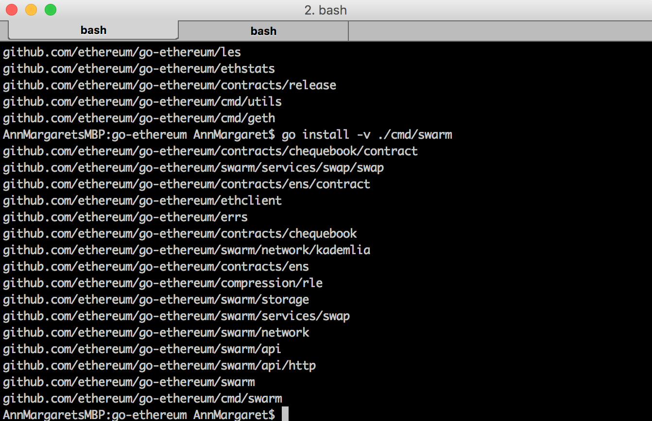 In the background, the go install command creates our Geth and Swarm binaries in the workspace’s bin directory (located at ~/go/bin).