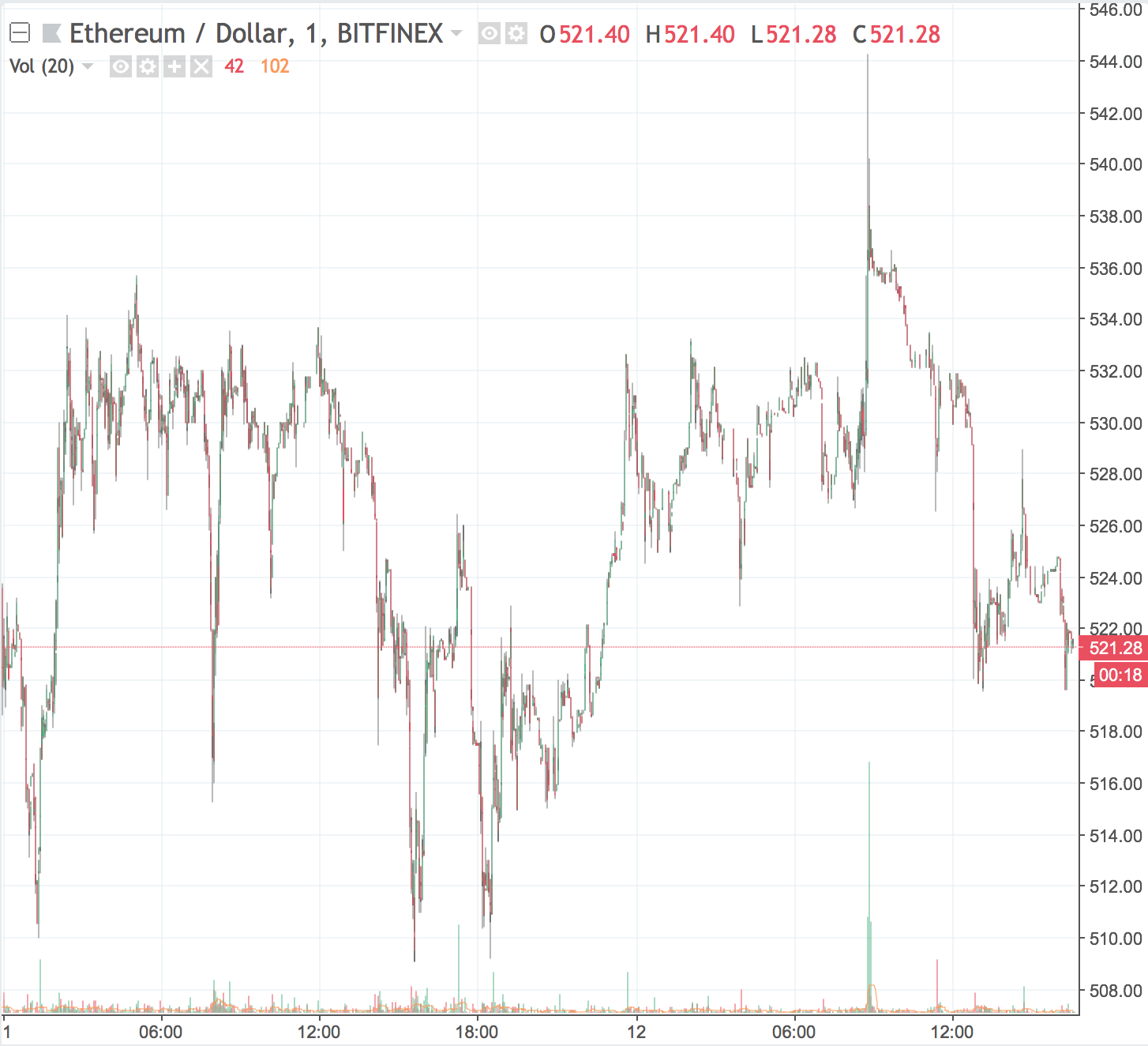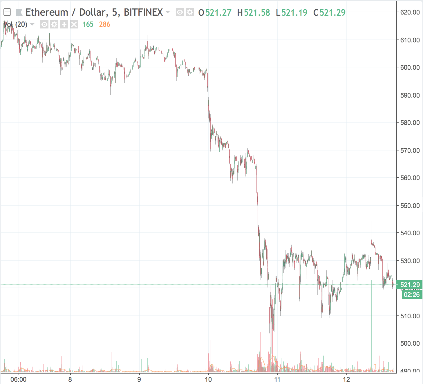 As you can see when comparing these three charts, Ethereum values took a dive at the end of May and had been steadily consolidating to the $600 level throughout the month of June. Unfortunately, Ethereum has lost approximately $100 in value a few days ago, but that could provide some opportunities if the market behaves in a similar manner to how it handled the last precipitous drop. When looking to the slightly expanded 1-day chart, which we provided for today, you can observe a roughly 24 hour cyclical sine wave. If you pick a time and look 24 hours before or after that time, Ethereum’s value has almost returned to where it began, with an alternating dip and rise pattern. This type of a pattern can be a short-term investors dream, as it allows for multiple “buy low, sell high” opportunities for as long as the pattern persists. As we stated yesterday, Ethereum experienced a similar drop at the end of May, before steadily climbing back up and stabilizing at the $600 level. As a result of this historical trend, markets will likely see an influx of traders seeking to exploit a “buy low, sell high” opportunity here before the markets recover to somewhere between $580 and $600 (assuming a similar percentage recovery as the last post-dip period).