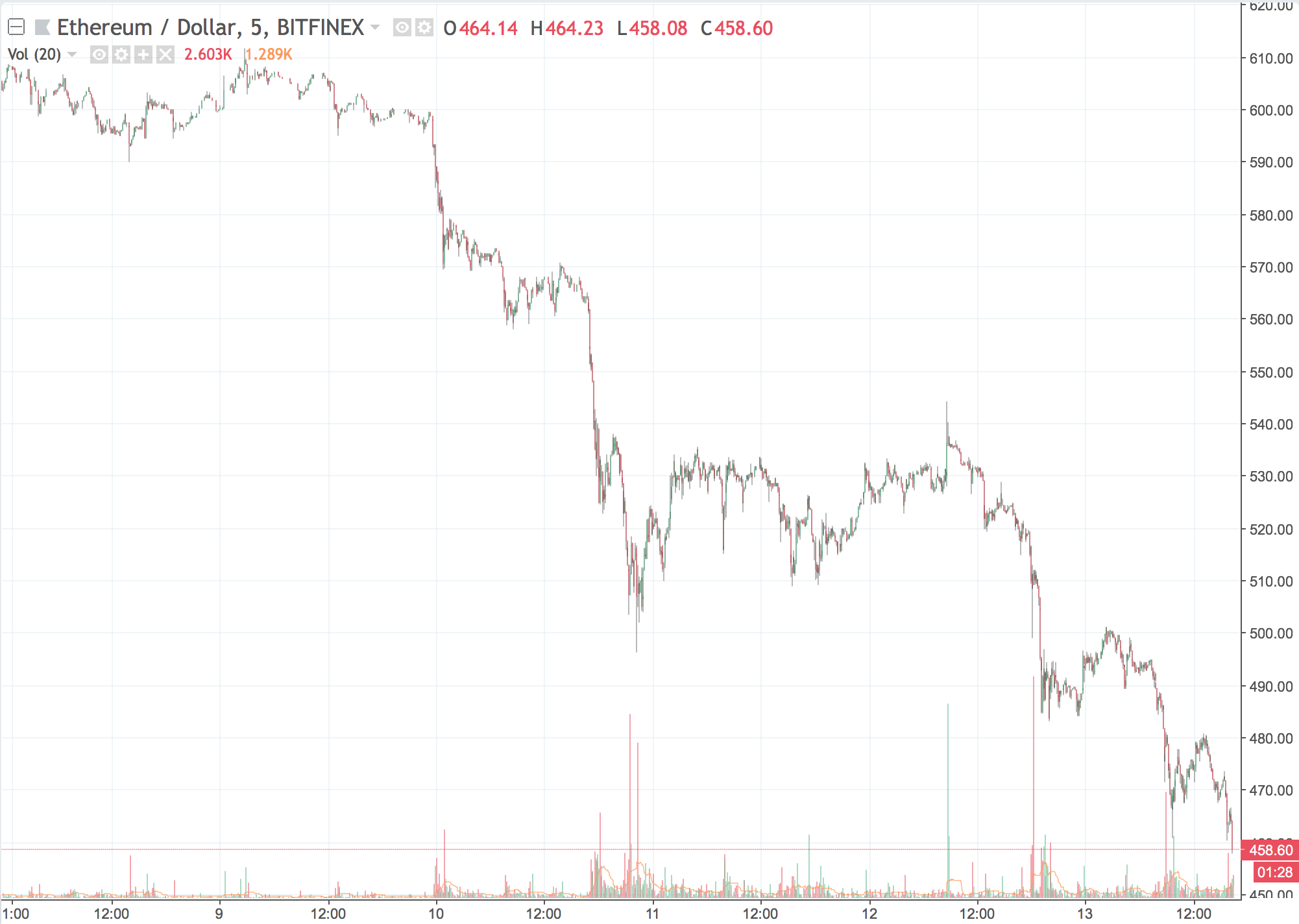 As you can see when comparing these three charts, Ethereum values took a dive at the end of May and had been steadily consolidating to the $600 level throughout the month of June. Unfortunately, Ethereum has lost approximately $100 in value a few days ago followed by another nearly $100 drop down to just above $450. CrytpoNews24/7 expects this current plummet to continue down towards $380-$400 before we experience another slight stabilization. When looking to the slightly expanded 1-day chart, which we provided for today, you can observe a roughly 24 hour cyclical sine wave. If you pick a time and look 24 hours before or after that time, Ethereum’s value has almost returned to where it began, with an alternating dip and rise pattern. This type of a pattern can be a short-term investors dream, as it allows for multiple “buy low, sell high” opportunities for as long as the pattern persists. As we stated yesterday, Ethereum experienced a similar drop at the end of May, before steadily climbing back up and stabilizing at the $600 level. As a result of this historical trend, markets will likely see an influx of traders seeking to exploit a “buy low, sell high” opportunity here before the markets recover to somewhere between $580 and $600.