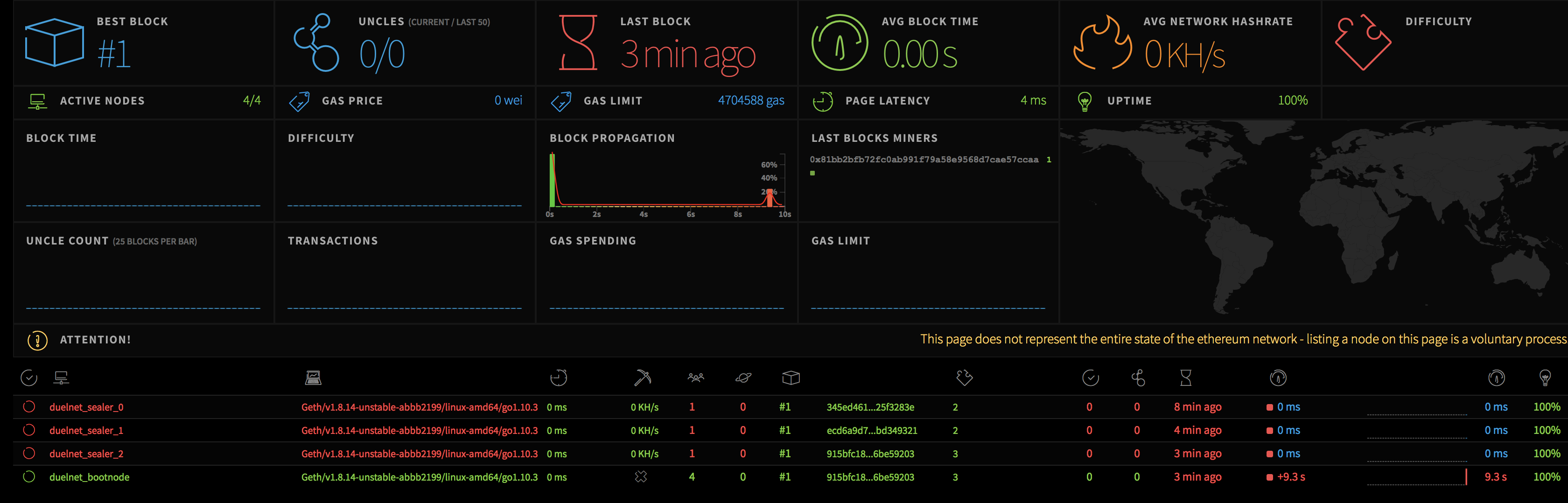 위의 과정을 진행하여 3개의 노드가 Sealer 노드로 모두 참여시켜 네트워크를 구성한 후 다시한 번 웹 브라우저에서 Ethstats 방문한다면 아래와 같은 화면을 만나볼 수 있을 것이다.