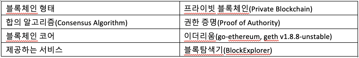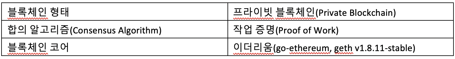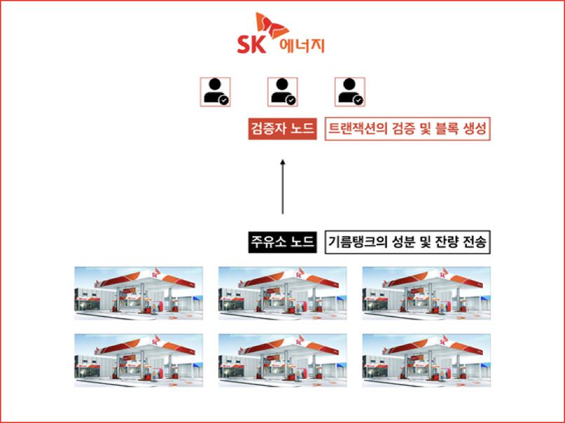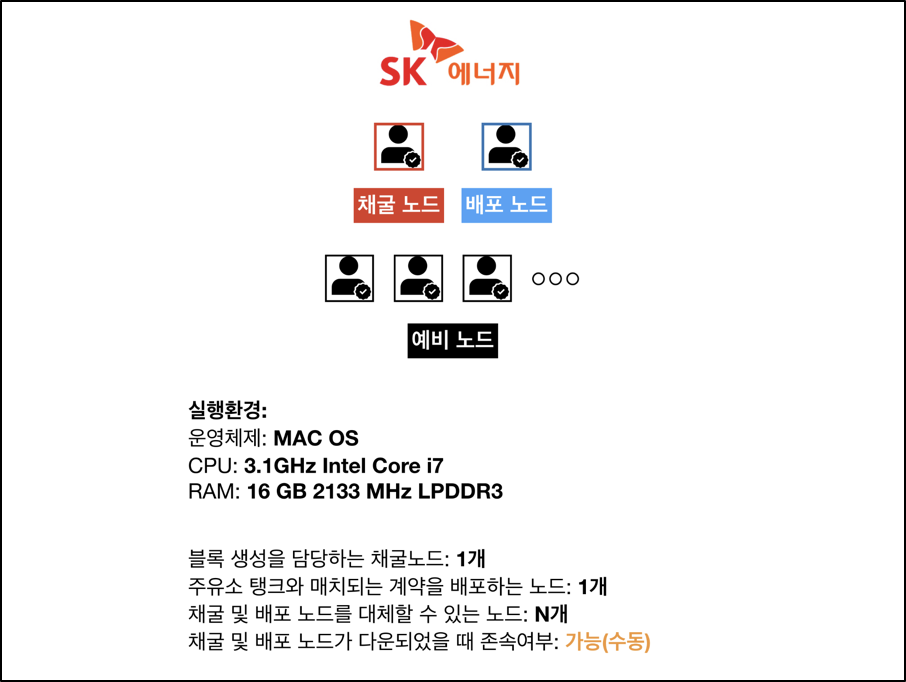 시스템은 이더리움 합의엔진 중 Clique PoA(Proof of Authority)를 활용하며 다음과 같이 크게 두 가지 요소로 구성이 되어 있다. 정유사(SK 에너지 등) 노드와 가맹 주유소 노드로 구성되어 있으며, 아래 그림은 시스템의 개략적인 구성도이다.