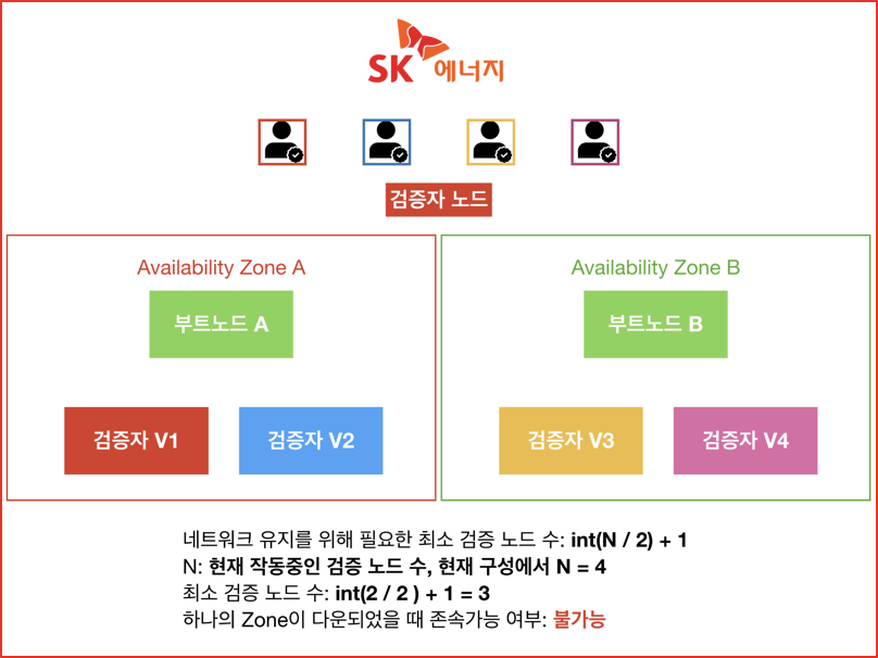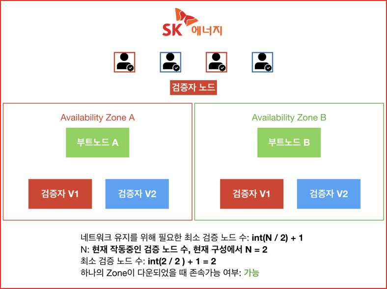 따라서 최소 검증 노드 수는 2개가 되고 둘 중 하나의 권역이 다운되더라도 네트워크는 이상없이 동작할 수 있다.