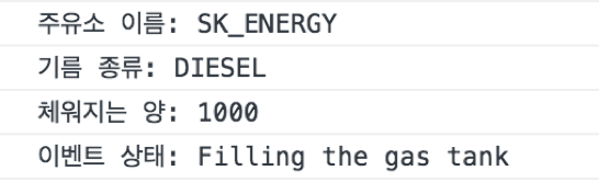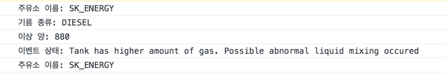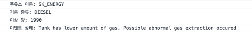 2번 필드를 살펴보면, “SK_ENERGY” 주유소의 “DIESEL”(경유) 탱크에 “Filling the gas tank” 이벤트가 발생하였음을 확인할 수 있다. 그 아래 필드는 기록되어 있는 블록 번호, 블록 해시, 트랜잭션 해시 등의 정보가 기입되어 있고 결과값으로 나온 정보 중 필요한 내용을 파싱하여 출력해보면 아래와 같다.