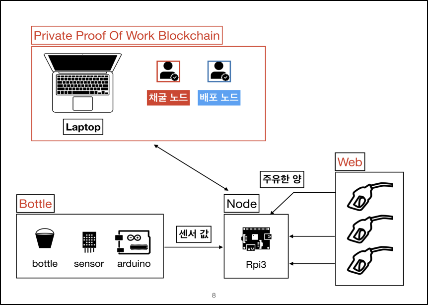 - 측정된 센서 값을 이더리움 네트워크로 전송 해주는 역할은 라즈베리파이(Rpi)가 수행하며 라즈베리 파이는 중간에 연결되어 있는 아두이노를 통해 센서값을 읽어온다. 중간에 아두이노를 둔 이유는, 향후 탱크의 개수가 많아질 때 라즈베리 파이를 늘리는 것이 아니라 아두이노만 늘리는 방식으로 설계할 수 있기 때문이다. 즉, 모든 탱크에서 측정되는 데이터는 라즈베리 파이 한 대가 이더리움 네트워크로 전송하게끔 되어 있다.