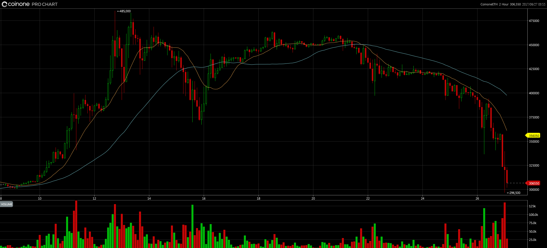Wow it is 4:00 A.M. in South Korea and on coinone.co.kr a South Korea exchange, Ethereum drops about 25% in a 24 hour period. And 37% over the past 15 days.